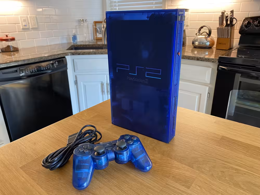 However, for me there's something about having the physical system that I just find rewarding. Warts and all, I enjoy interacting with the actual, original hardware. I enjoy creating an optimized set up for all of my devices. Perhaps most of all, I also enjoy translucent colored plastics. Therefore, when I discovered that Sony produced a Japanese-only version of the PS2 which game in a translucent blue shell, I prowled the internet auction sites until one finally came my way.